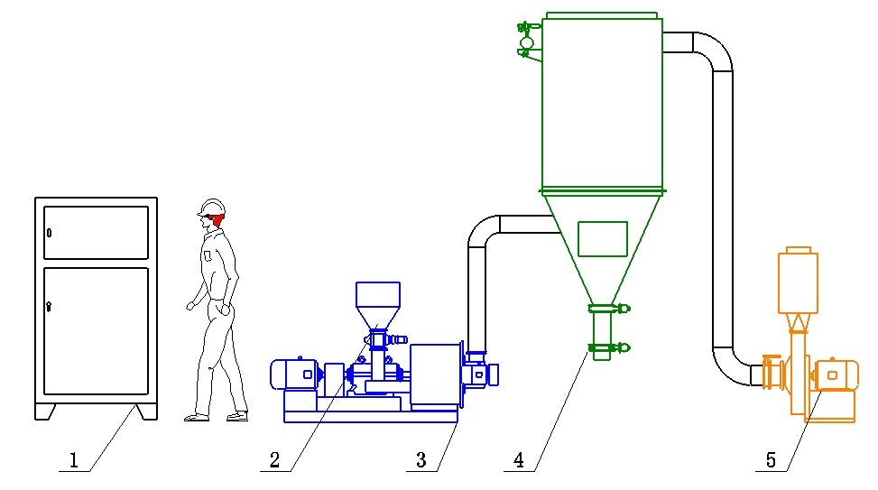 1、電控柜 2、 加料系統 3、DR主機 4、袋式除塵器 5、引風機