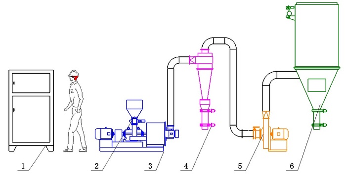 1、電控柜 2、 加料系統 3、DR主機 4、旋風收集器 5、袋式除塵器 6、引風機