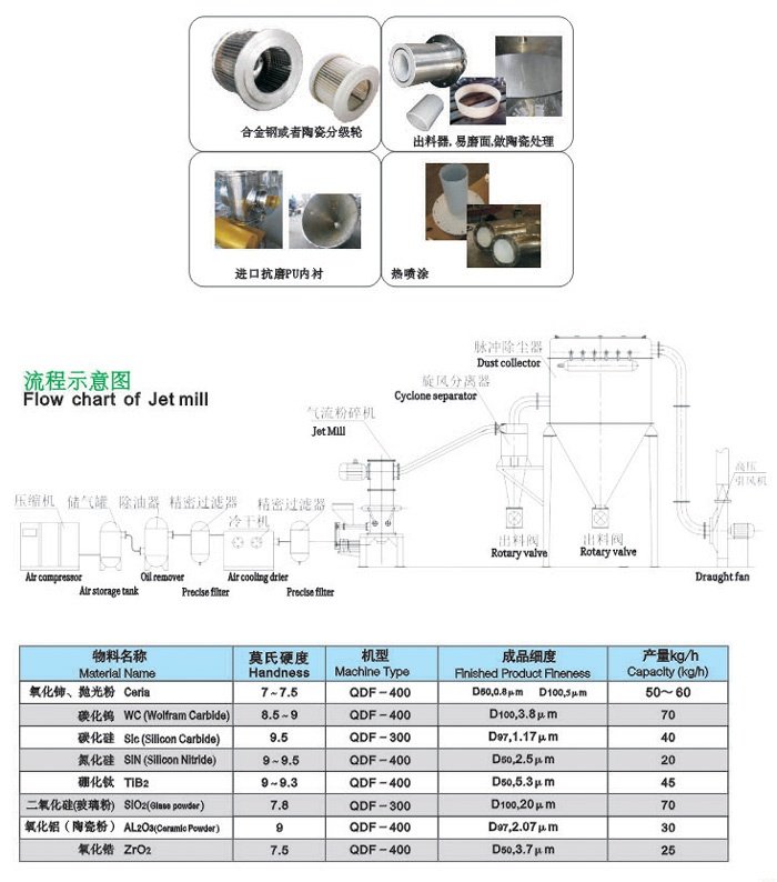 分級輪采用合金鋼或高硬度陶瓷;出料器,易磨面做陶瓷處理;進口抗磨PU內(nèi)襯,熱噴涂等