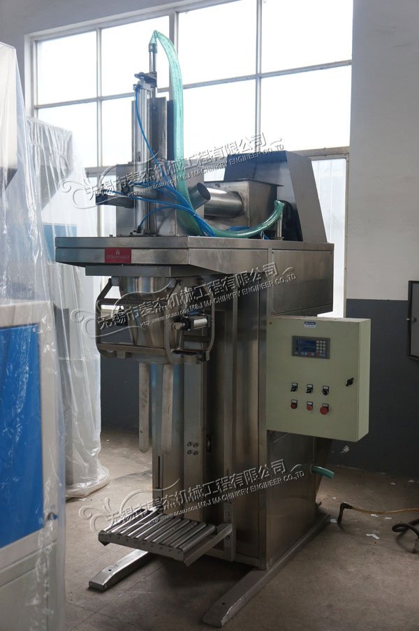 該包裝機主要由自動定量包裝機(由儲料斗、喂料器,稱重夾袋斗,揉實機構,電腦控制,氣動執行部分等構成)與選配部分(輸送機、縫口機/熱合機)組成。