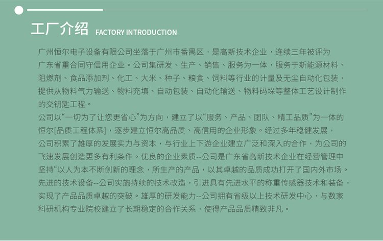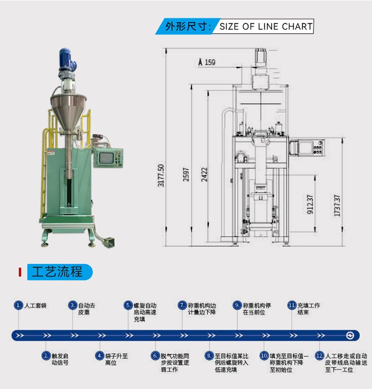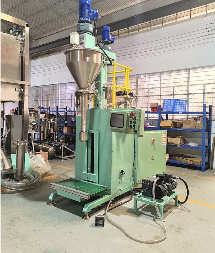 產品概述:本產品旨在為超細粉末提供精確稱重和包裝服務。它特別適用于細粉、超細粉和高粘性粉料。簡要說明:此機器是專為易揚塵、飄浮問題嚴重的超細粉末物料設計的。其運行過程包括根據容器下面的重量傳感器信號進行雙速(三速)充填、計量和升降操作。在充填過程中,脫氣裝置能將超細粉物料中的空氣排出,從而保證出料口處的物料以團簇狀態填充到袋中,從而有效減少粉塵。此外,它也適用于裝載超細石墨粉、鋰電池粉、磷酸鐵鋰、正極材料、負極材料、硅微粉、煤粉、消光劑、各種添加劑、滅火器干粉、其他超細粉末以及具有高精度包裝要求的粉末等。
