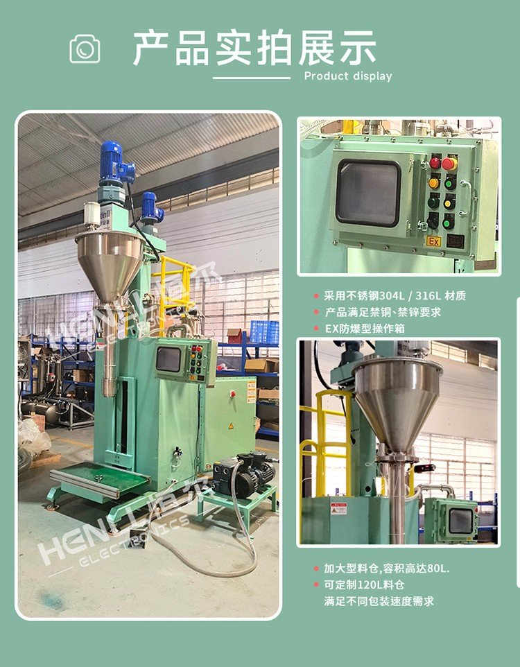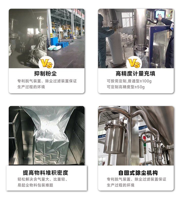 采用專利脫氣裝置,提高物料堆積密度。保證填充精度,抑制粉塵產生。提高生產效率的同時降低人工成本。