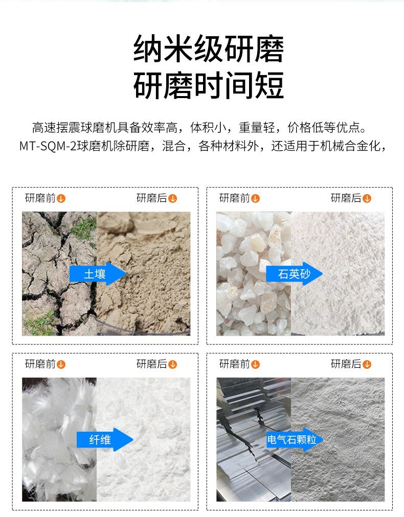 MT-SQM-2球磨機(jī)除研磨、混合、各種材料外,還適用于機(jī)械合金化,幾種金屬或者非金屬的粉末或顆粒,在高能球磨過程中反復(fù)混合、破碎和冷焊,在球磨中逐漸細(xì)化,并在固態(tài)下形成合金相的核,使過去傳統(tǒng)熔煉工藝難以實(shí)現(xiàn)的某些物質(zhì)在球磨過程中實(shí)現(xiàn)合金化。