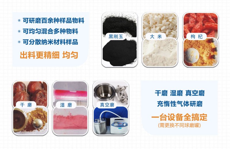 儀器采用行星式球磨的方式,使用復合式皮帶傳動,轉速更高,噪音更小,液晶觸摸大屏顯示,變頻無級調速,程序控制,至多存儲50組參數,快速裝卸卡具