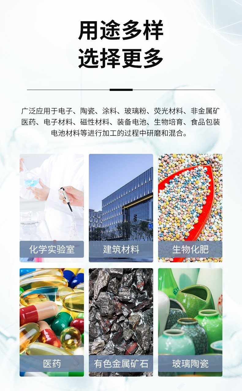 廣泛應用于地質、礦產、冶金、電子、建材、陶瓷、化工、輕工、醫藥、美容、環保,抹茶等科研及材料生產部門。如珍珠,人參,鐵皮石斛,藥片,藥劑,甘草,焦炭,煤,玻璃,纖維素,紙張,芯片,聚合物,色素,金屬氧化物,鐵礦石,鐵粉,鋁粉,鎂粉,陶瓷,氧化鋁,骨頭,高嶺土,石灰石,石膏,石英,礦物,礦石,碳化纖維,石墨,油墨,粘土礦物,纖維制品,下水道污泥,催化劑,化學品,合金,土壤,廢棄樣品,木頭,植物原料,水泥熔渣,混凝土,爐渣,煙草..