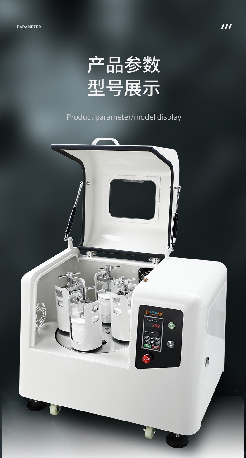 行星式球磨機主要是初級破碎(0.5-3mm),細磨(5-75um),精磨(0.1um)、混合、小樣制備、納米材料研磨,分散、合金,合成,新產品研制和小批量生產高新技術材料的必備裝置。該產品體積小、功能全、效率高、噪聲低,是科研單位、高等院校、企業實驗室獲取微顆粒研究試樣(每次實驗可同時獲得四個樣品)的理想設備,可配用真空氣氛球磨罐,可在真空氣氛保護狀態下磨制試樣。行星式球磨機適合堅硬、中等硬度、脆性和纖維材料的濕法及干法粉碎和細化,出樣細度可小于0.1um,亦可用于懸浮液中固體的研磨、樣品混合和均一化處理以及金屬合金化等,均可達到理想的效果。