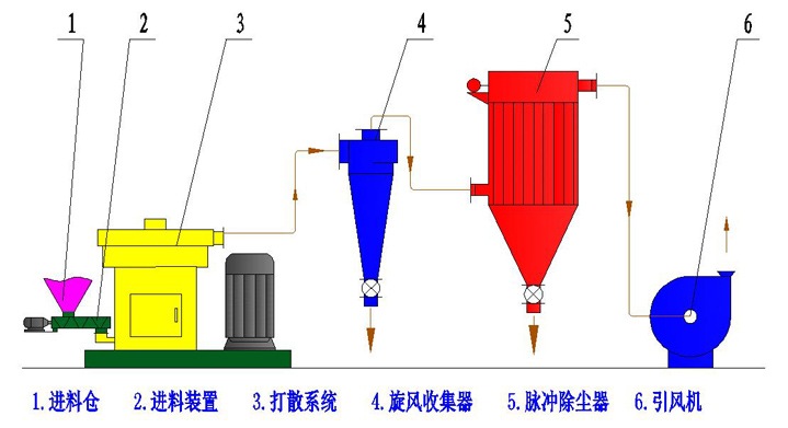 團聚性或結塊物料經螺旋給料機送入打散腔內,經高速旋轉的轉子對物料進行沖擊、剪切,使物料粉碎還原。打散后的物料被上升氣流輸送至物料收集區,被旋風收集器和脈沖除塵器收集,凈化的空氣由引風機排出。