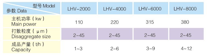 主要用于粘性、強團聚性或煅燒結塊粉體的解聚打散,如超細煅燒高嶺土、水洗高嶺土、納米碳酸鈣、化工原料、染料等。