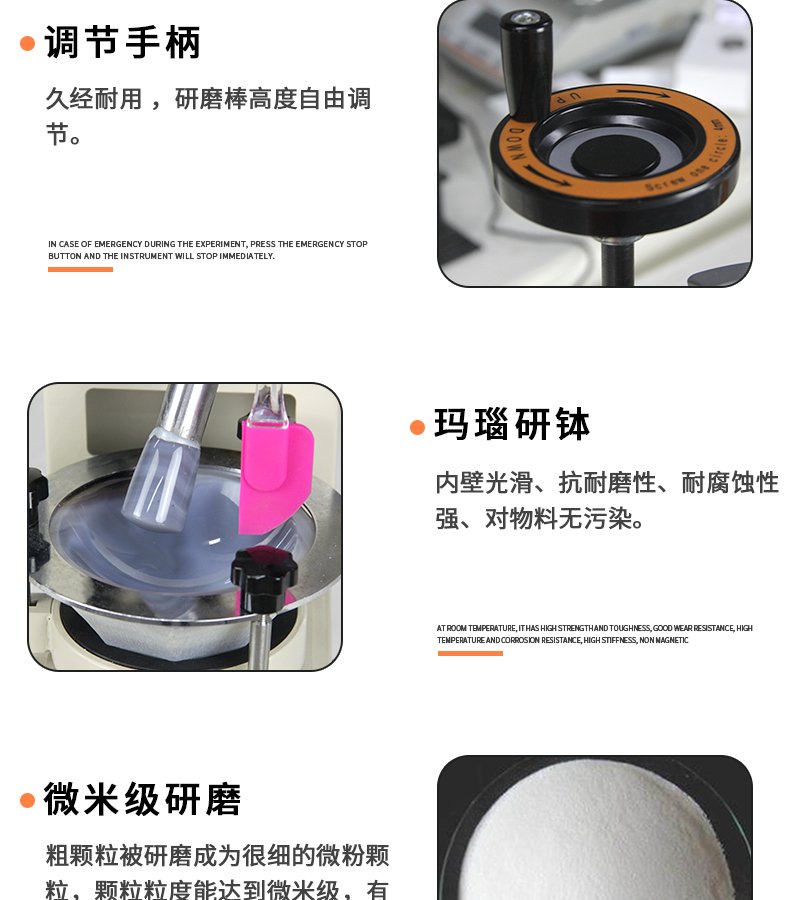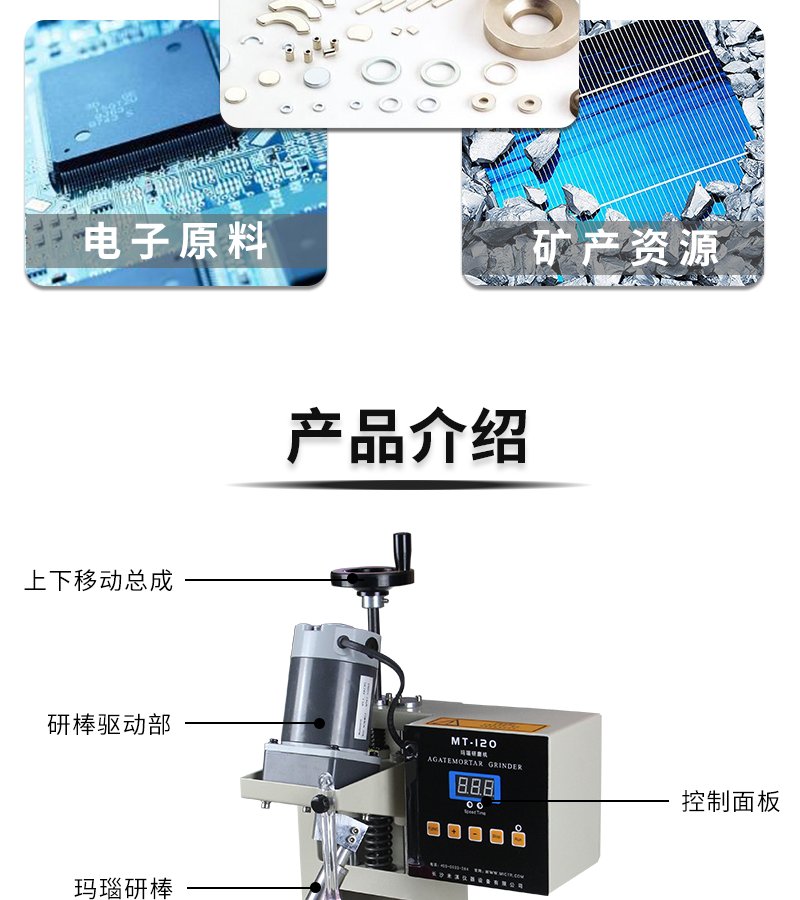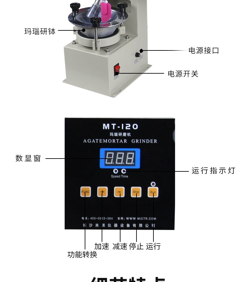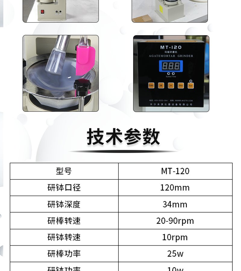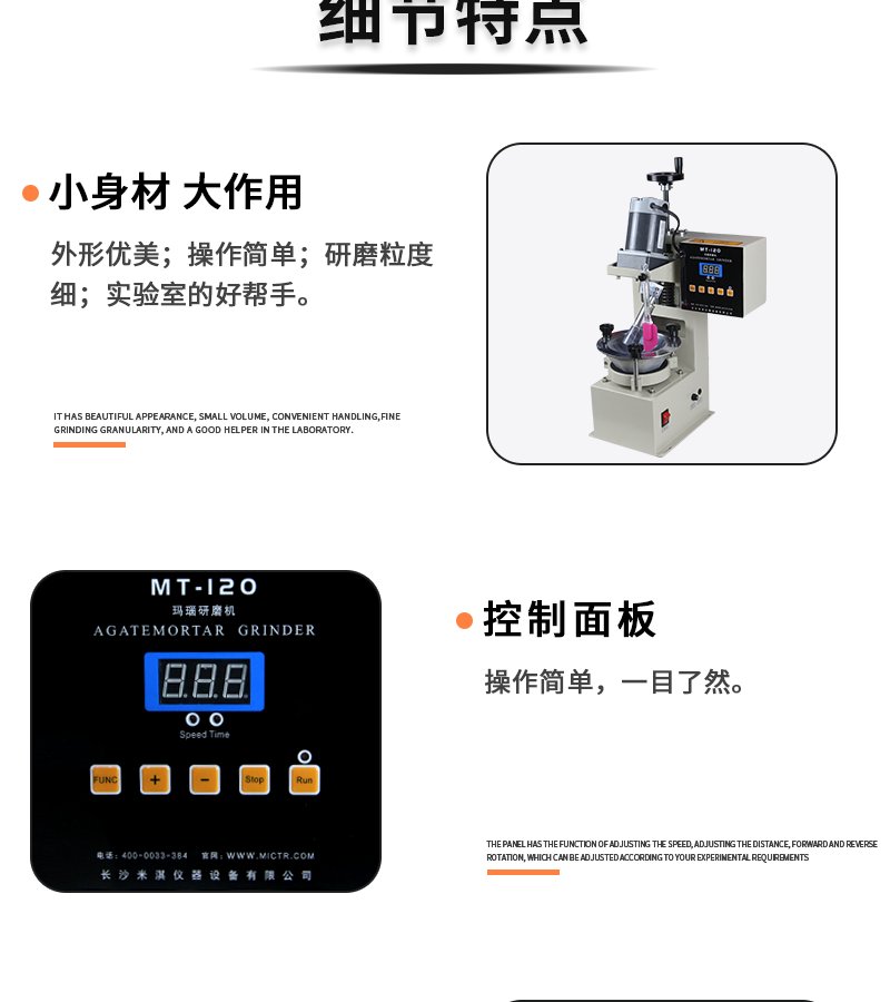 MT-120型瑪瑙乳缽式微粉研磨機,具有操做簡單,研磨細度可達微米級。替代了以往的研缽繁重的手動研磨,解放了雙手、節省了時間,碾磨效果也遠遠超過手動的研磨。公司自主研發的控制系統分別對碾磨棒轉速、碾磨時間精確控制。是實驗室碾磨微粉的**設備。