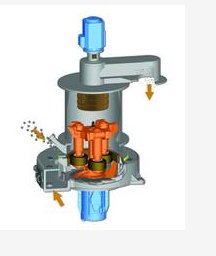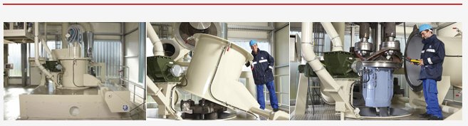 原料通過進(jìn)料裝置輸送進(jìn)入研磨機(jī),并掉落到研磨機(jī)下磨腔的底部。位于每個磨輥前的鏟刀在旋轉(zhuǎn)時從底部鏟起物料送至磨輥和磨環(huán)之間的位置,即物料研磨區(qū)。空氣流將磨碎的物料從研磨機(jī)下磨腔帶起進(jìn)入研磨機(jī)頂部的靜態(tài)或動態(tài)分級機(jī)。通過調(diào)節(jié)分級機(jī)可以控制物料產(chǎn)品所需粒徑。被分離出來的粗顆粒物料落回到研磨機(jī)重新進(jìn)行研磨。細(xì)粉則通過分級機(jī)被抽吸進(jìn)入集塵器中。
