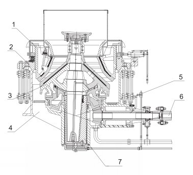 1.調整套部 2.支撐套部 3.破碎圓錐部 4.機架部 5.彈簧部 6.傳動部 7.偏心套部