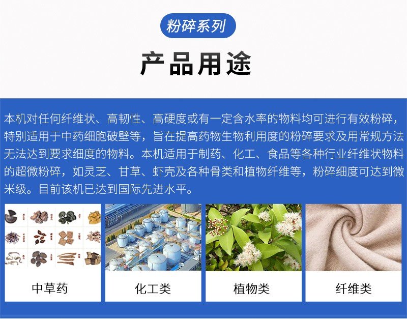 本機WFM型超微粉碎機對任何纖維狀、高韌性、高硬度或有一定含水率的物料均可進行有效粉碎,特別適用于中藥細胞破壁等,旨在提高藥物生物利用度的粉碎要求及用常規(guī)方法無法達到要求細度的物料。本機適用于制藥、化工、食品等各種行業(yè)纖維狀物料的超微粉碎,如靈芝、甘草、蝦殼及各種骨類和植物纖維等,粉碎細度可達到微米級。目前該機已達到國際**。