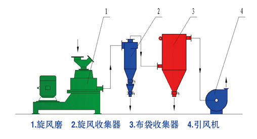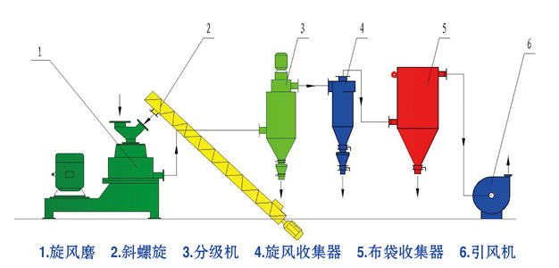 物料經變頻給料機自旋風磨頂部加入裝配有刀片轉子的粉碎腔,旋轉的刀片轉子在粉碎腔內產生超高速的空氣旋流,物料在空氣旋流作用下進入到轉子與定子的間隙內迫使顆粒之間的沖擊、剪切、摩擦,造成顆粒在高應力下的裂解細化,從而實現物料粉碎。粉碎腔內部結構經科學設計,腔內的空氣旋流運動導向明確,無流動死角,也保證了粉碎過程中無溫升。物料粉碎細度可通過不拆機調整定子與轉子之間的間隙來控制。粉碎后的物料可經負壓輸送裝置進入收集器收集,也可經外配分級機進行精細分選、粗粒續磨作業。