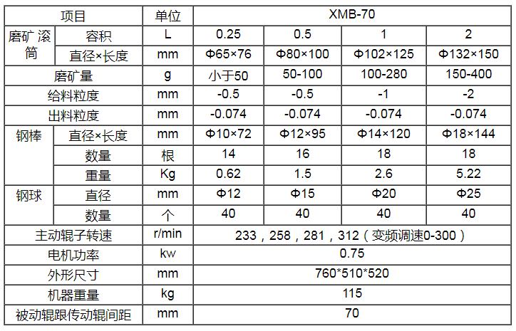 XMB70型三輥四筒棒磨機,是一種實驗室用小型、輕便、多用途的新型磨礦設備,可以單筒或多筒同時磨礦,可以干、濕兩用,亦可用鋼球代替鋼棒作球磨機使用,先進的變頻技術保證了調速范圍寬、變速平穩。可供冶金、地質、化工、建材、煤炭及大專院校、科研單位、礦山選礦廠等進行可選性研究時磨細礦石之用。