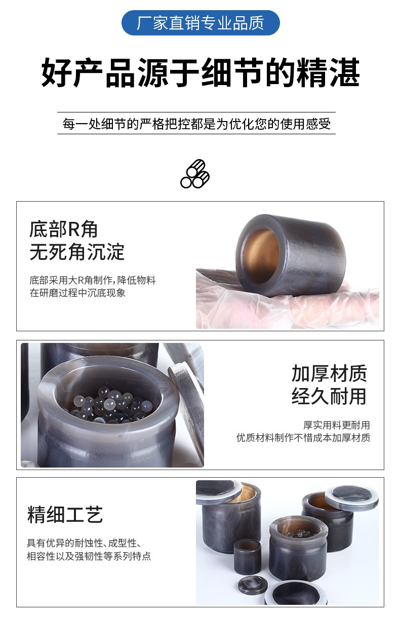 1 采用磨具制作,內外壁光滑度極高,避免物料研磨過程中沾壁問題 2 采用全新進口原材料制作,耐氧化性強. 3 底部采用大R角制作,降低物料在研磨過程中沉底現(xiàn)象 4 其他公司的聚氨酯罐無法接觸酒精,本公司的可接受短時間內的酒精研磨, 5 研磨效率高,使用壽命長 6、根據(jù)市場需求制作,符合配套國內其他廠家行星式球磨機