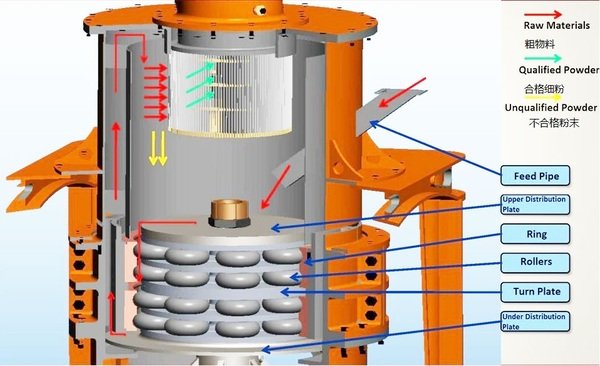 大塊物料經錘式破碎機破碎成小顆粒后,由提升機送入儲料倉,再經過振動給料機和傾斜的進料管,將物料均勻地送到轉盤上部的散料盤上。物料在離心力的作用下散向圓周邊,并落入磨環的滾道內被環輥沖擊、滾輾、研磨,經過三層環道的加工變成粉體,通過高壓風機的抽吸作用將外部空氣吸入機內,并將粉碎后的物料帶入選粉機內。 GYM系列輥壓磨的選粉機內旋轉的葉輪使粗物料回落重磨,符合要求的細粉則隨氣流進入旋風集粉器并由其下部的卸料閥排出即為成品,而帶有少量細粉塵的氣流則經過脈沖除塵器凈化后通過風機和消聲器排出。 性能優點: 1、投資省、效率高,與大型成套設備相比,投資節省60%。 2、節能:是當前能耗*低的一種細磨設備,主機電耗<100kW·h/t。 3、易損件使用壽命長,磨輥、磨環采用特殊材料鍛制而成,從而使利用程度大大提高。在物料及成品細度相同的情況下,比沖擊式破碎機與渦輪粉碎機的磨損件使用壽命長2-5倍,一般可達一年以上,加工碳酸鈣、方解石時,使用壽命可達1-5年。 4、破碎比大,能量利用率高。入料粒度<15mm的碳酸鈣,一次加工<10μm的微粉,其中-2.5μm的細粉占40%左右,比表面積大。它具有高速沖擊式粉碎機生產粉體的高效、低耗的優點,而又有接近氣流磨的產品細度。 5、產品粒度可調,細度好,是當前干法生產非金屬礦細粉的理想設備。主機內置分級機構,分級輪結構獨特,不跑粗粉,可根據需要調節產品細度,它既可生產D97=3-8μm的細粉,亦可生產D97=10-40μm的粗粉。a性。不用專用混凝土基礎就能安全使用,降低設備的安裝費用。 7、傳動效率高,主軸采用減速機傳動,其能耗低、效率高,效率≥96%。 8、符合環保排放標準,粉塵排放低于40mg/m3。 應用范圍: 1、本機適用于莫氏硬度≤6的脆性物料的粉碎,如重鈣、硅灰石、高嶺土、赤鐵礦、滑石、重晶石、長石、爐渣 等物料的粉碎加工,要求給料粒度不大于15mm,水份小于10%。 2、本機亦可用于不帶膠質短纖維物料的超細粉碎,如木粉加工,要求入料粒度不大于2mm,水份小于5%,粉碎后產品細度D97=43-860μm。 特別提示:德爾粉體設備公司的輥壓磨針對人造石墨、核桃殼等輕質物料進行了結構優化,可大大提高粉碎效率。