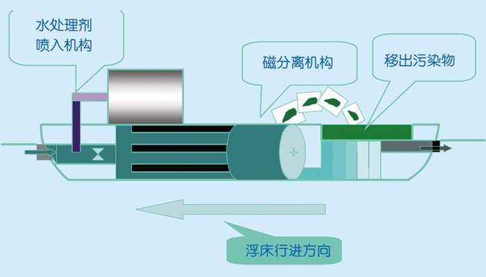 整個裝置包括浮床、湖泊原水檢測系統,曝氣系統,絮凝劑自動配置和投加系統,攪拌機組,絮體自動檢測系統,磁分離系統,磁分離后水體中殘余絮體再分離系統,處理后水質自動檢測裝置等子系統。每小時處理水量1000立方米,強絮凝功能的磁聚水處理劑配方1~2劑,絮體移出效率達到95%以上,水體達到Ⅲ類水標準。