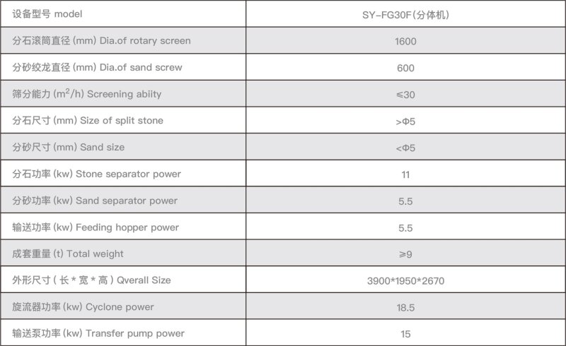 SY-FG30F 型砂石分離機產品結構主要由分砂裝置、分石裝置、輸送裝置等部分組成。