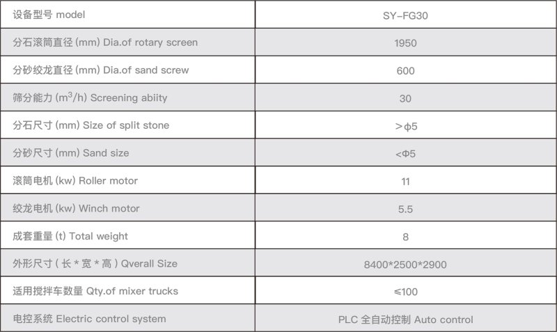 SY-FG30 砂石分離機主要由分砂絞龍和分石滾筒兩大部分組成,該型號有正反兩種方向,分為單車位、雙車位兩種配置,可根據現場情況靈活布置。