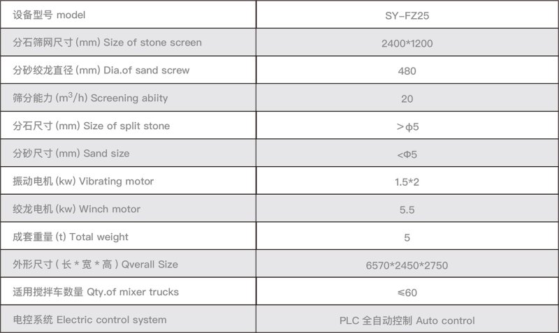 SY-FZ25 砂石分離機主要由分砂絞龍和振動篩兩大部分組成,該型號有正反兩種方向,分為單車位、雙車位兩種配置,可根據現場情況靈活布置。該型號石分離機利用振動電機激振作為振動動力來源,使物料在篩網上被拋起,同時向前作直線運動,通過特殊規格的篩網高強度震動篩分排出。具有耗能低、產量高、結構簡單、易維修、敞開式結構,自動排料等特點,適合于混凝土攪拌站廢料及剩料處理。