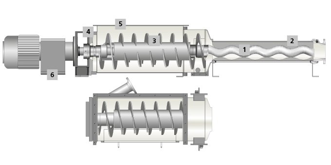 1 轉(zhuǎn)子 耐磨損、抗腐蝕設(shè)計(jì)。 2 定子 管內(nèi)硫化,兩端密封,采用多種橡膠、塑料和金屬材料制成。定子入口帶有喇叭口,以便物料容易進(jìn)入輸送腔中。 3 混合與螺旋送料器 混合與螺旋送料器的強(qiáng)化與交錯(cuò)螺旋葉片確保大程度介質(zhì)均化。 4 軸密封 單端面與耐用傳動(dòng)密封確保大程度運(yùn)行安全性。 | ![]() |