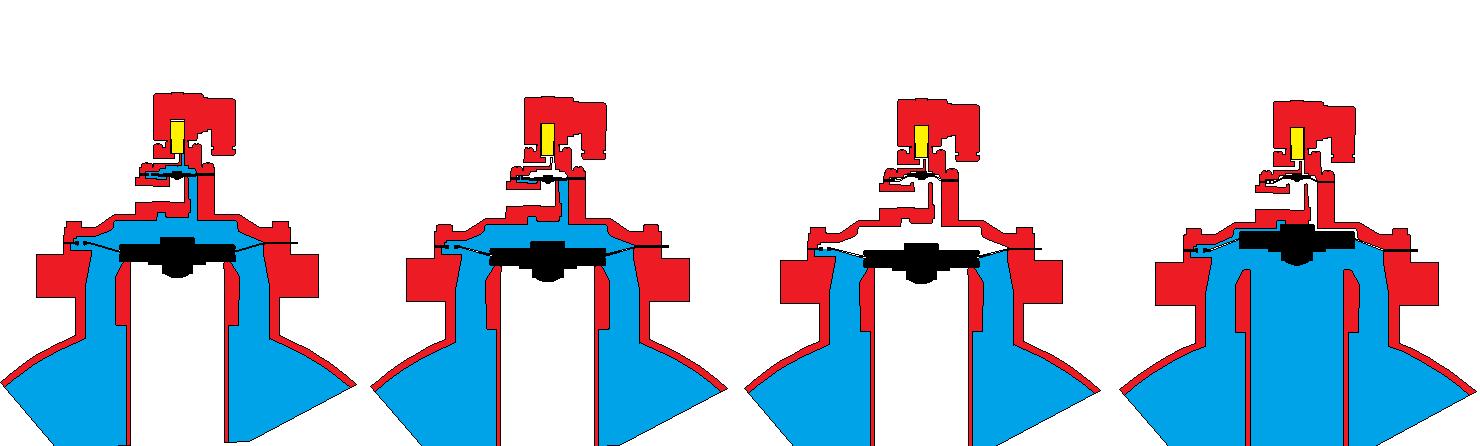 利用膜片上的節(jié)流孔平衡壓力形成密封,氣包內(nèi)的壓縮氣體可以通過(guò)節(jié)流孔到達(dá)膜片的上方腔體,由于存在受壓面積差,造成壓力差,使膜片的密封面緊緊壓在閥體密封座上,形成密封。當(dāng)需要工作時(shí),電磁線圈驅(qū)動(dòng)動(dòng)鐵芯工作,打開(kāi)泄氣孔,破壞壓力平衡,膜片被氣體推開(kāi),脈沖閥被打開(kāi)。繞線線圈通電后產(chǎn)生磁場(chǎng)力,磁力克服動(dòng)鐵芯所受的氣體壓力、彈簧力及自重,把動(dòng)鐵芯吸合,動(dòng)鐵芯吸合后小膜片上方腔體與脈沖閥外部聯(lián)通,上方氣體迅速排出,小膜片上節(jié)流孔補(bǔ)氣速度低于泄氣速度,故小膜片被氣壓推開(kāi),這樣大膜片上方腔體與外部被聯(lián)通,內(nèi)部氣體瞬間排出,大膜片的節(jié)流孔補(bǔ)氣速度低于排氣速度,故壓力降低,膜片下部壓力大于上部壓力,迅速把大膜片推開(kāi),這樣脈沖閥就比開(kāi)啟,形成瞬間噴吹。當(dāng)電信號(hào)關(guān)閉后,繞線線圈失電,磁場(chǎng)里消失,動(dòng)鐵芯在彈簧力的作用下復(fù)位,氣壓迅速建立并密封,關(guān)閉了小膜片上方腔體與外部的聯(lián)通,壓縮氣體通過(guò)節(jié)流孔迅速進(jìn)入小膜片上方,壓力恢復(fù)并密封,同理大膜片關(guān)閉密封,脈沖閥關(guān)閉。