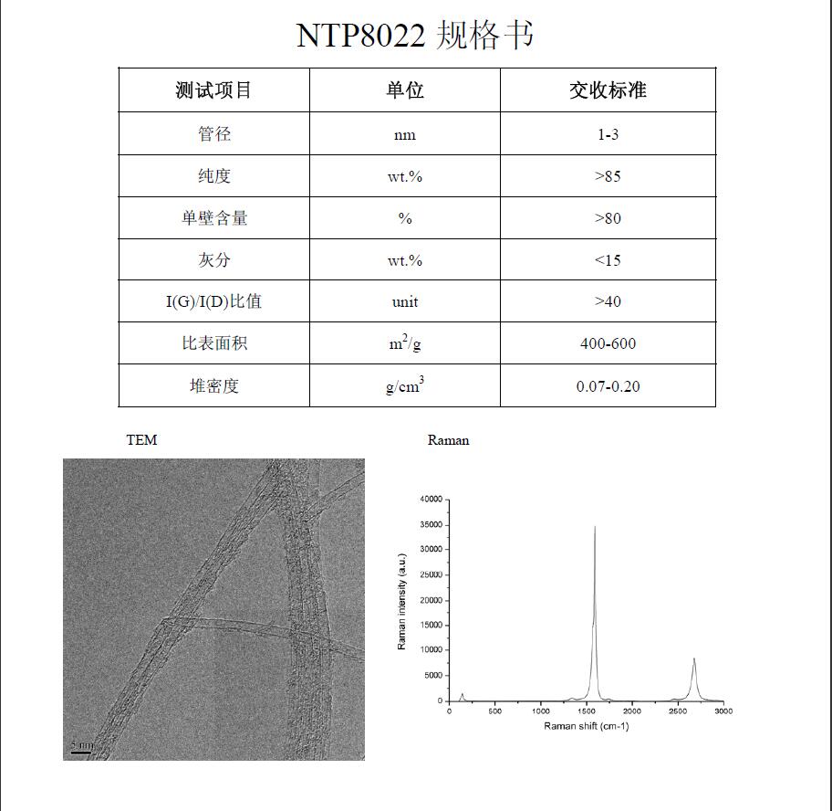 | NTP8022 | 1-3nm | >15μm | >85% | 400-600m2/g | 2g |