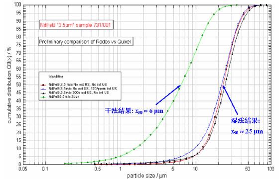 應用干法激光粒度儀HELOS&RODOS:NdFeB干濕法分散測試結果比較: