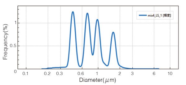 下圖為離心粒度分析儀測(cè)量含有四種相同濃度的二氧化硅標(biāo)準(zhǔn)顆粒的混合樣品的結(jié)果,四種不同粒徑顆粒所占面積幾乎相同。因?yàn)轭w粒按離心力分類,使用密度梯度模式測(cè)量可以獲得準(zhǔn)確的粒度分布。