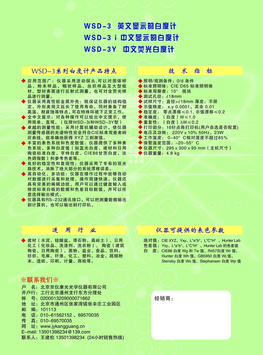 便攜式白度計WSD-3i參數: 照明/觀測條件: 0/d 條件 標準照明體: D65 標準照明體 標準觀察者: 10° 視場 測試孔徑: ¢18mm 試樣尺寸: 直徑>¢18mm 示值精度: x,y 0.0001,其余 0.01 穩定度: 零點漂移≤0.1, 示值漂移≤0.2 準確度: (白度)W≤1.0 重復性: (白度)ΔW≤0.3 打印部分:16針點陣打印機(用戶自選是否配置) 電壓及功耗: 220V±10% 50Hz,23W 工作溫度: 0-40°C 保管溫度范圍:-20-55°C 儀器尺寸: 295×300×95 mm(主機尺寸) 儀器重量: 4.8 kg