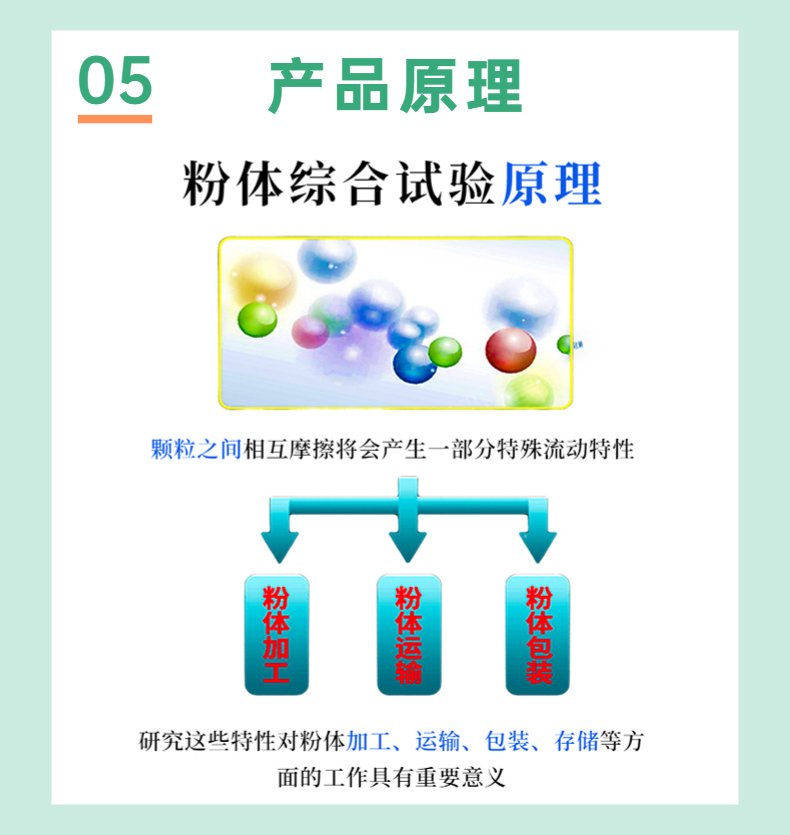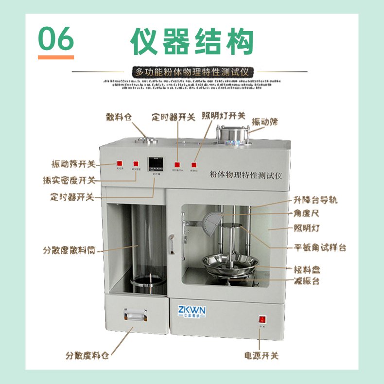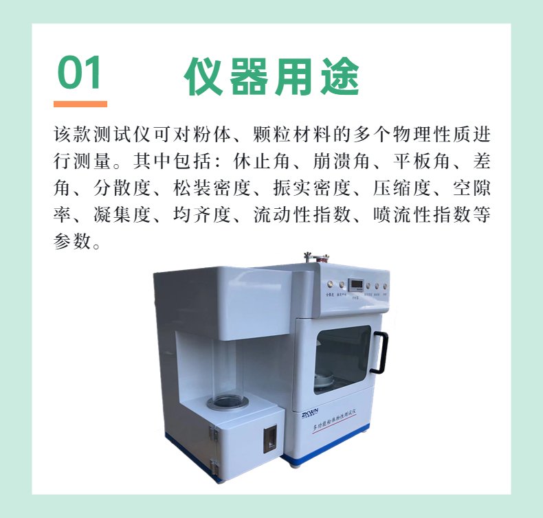 1、該款測(cè)試儀可對(duì)粉體、顆粒材料的多個(gè)物理性質(zhì)進(jìn)行測(cè)量。其中包括:休止角、崩潰角、平板角、差角、分散度、松裝密度、振實(shí)密度、壓縮度、空隙率、凝集度、均齊度、流動(dòng)性指數(shù)、噴流性指數(shù)等參數(shù)。