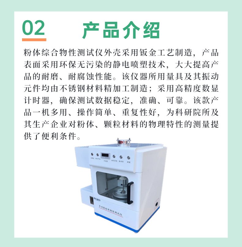 粉體綜合物性測(cè)試儀外殼采用鈑金工藝制造,產(chǎn)品表面采用環(huán)保無污染的靜電噴塑技術(shù),大大提高產(chǎn)品的耐磨、耐腐蝕性能。該儀器所用量具及其振動(dòng)元件均由不銹鋼材料精加工制造;采用高精度數(shù)顯計(jì)時(shí)器,確保測(cè)試數(shù)據(jù)穩(wěn)定,準(zhǔn)確、可靠。該款產(chǎn)品一機(jī)多用、操作簡(jiǎn)單、重復(fù)性好,為科研院所及其生產(chǎn)企業(yè)對(duì)粉體、顆粒材料的物理特性的測(cè)量提供了便利條件。