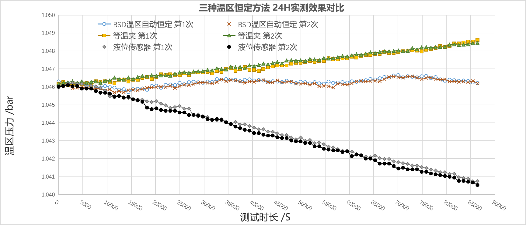曲線表明,三種方式溫區恒定效果24小時“吸附腔等效體積”的變化率分別為:BSD溫區伺服自動恒定:0.10%,等溫夾:0.25%,液位傳感器:0.55%