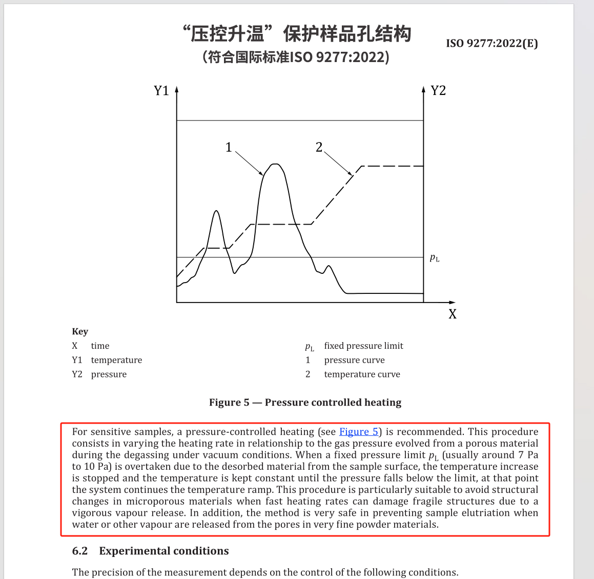 即由氣體壓力控制下的程序升溫技術,根據壓力變化自動啟停程序升溫,防止樣品放氣過快,從而防止樣品因快速放氣而造成樣品孔道被破壞;(該現象對微孔樣品較為常見。一旦造成樣品孔道破壞,難以被發現,是微孔樣品測試結果不穩定的重要因素來源之一);