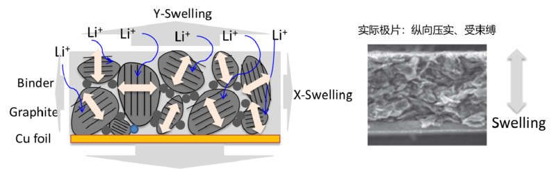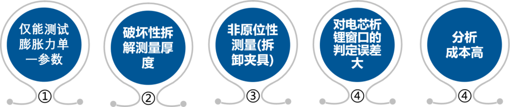 對于單體電芯的膨脹,其極片存在不可逆而造成的極片逐漸變厚、析鋰等(其原理如下圖所示),傳統的方法都是通過破壞性的,而且非原位的,測量效率低、誤差大,所以急需新的測試方法實現原位膨脹的測量,具體目標如下: