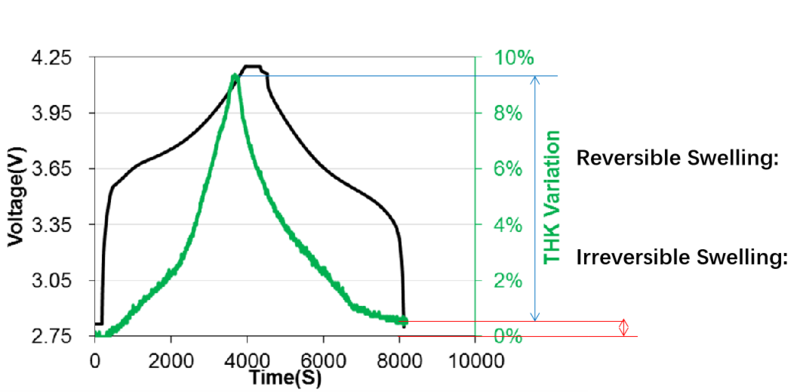 隨著循環的進行,電芯膨脹**厚度增加幅度為1-2μm;