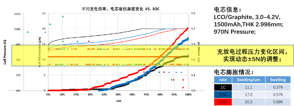 電芯壓力隨著電芯循環的進行壓力保持動態平衡不變;