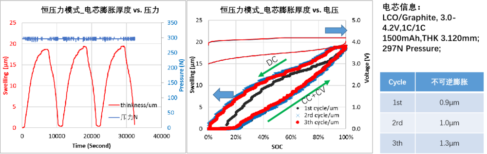電芯的不可逆膨脹厚度分別為0.9μm, 1.0μm, 1.3μm;