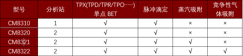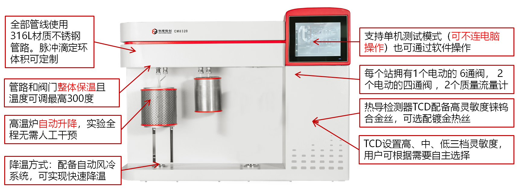 ChemiMaster 8310(CM8310)儀器基于動態技術,可進行TPD(程序升溫脫附)、TPR(程序升溫還原),TPO(程序升溫氧化)、脈沖化學吸附測金屬分散度、蒸汽吸附、BET單點比表面積的物理吸附分析、多組分競爭性吸附,用于測定催化劑材料的酸堿量、酸堿強度、貴金屬分散度、氧化還原性能、多組分競爭性吸附等重要指標。