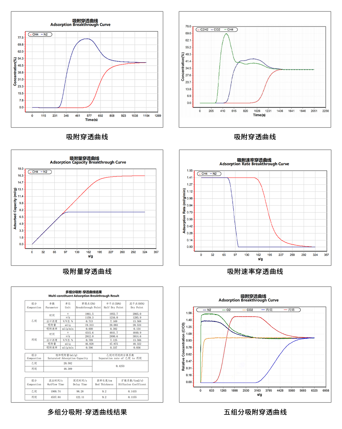 ◆ 利用吸附穿透曲線分析儀自帶熱導(dǎo)檢測器測定以下不同實驗條件的雙組份的吸附穿透曲線:不同吸附劑,不同溫度,不同壓力,不同床層厚度,不同氣體濃度,不同穿透流量等;