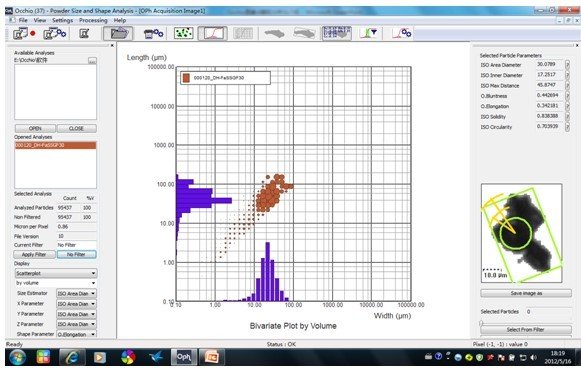 散點圖:可以得到粒徑參數對粒形數據的分布圖。根據操作者所選的粒徑分級,所有的圖都和顆粒一致,操作者也可以在圖中點擊讓所點顆粒可視化。