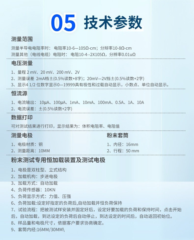 由于粉末材料的密實度不同,在松裝和振實密度條件下,所測試得到的數據是不同的,所以測試粉末電阻,要求在規定的壓力條件下進行測試.便于進行有效數據的測試及對比.