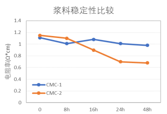 不同CMC(漿料穩定劑)應用于石墨負極配方中,將影響漿料的沉降性能(穩定性),通過監控漿料的電導率測量變化,可判定評價原材料的應用效果;