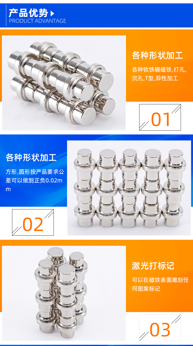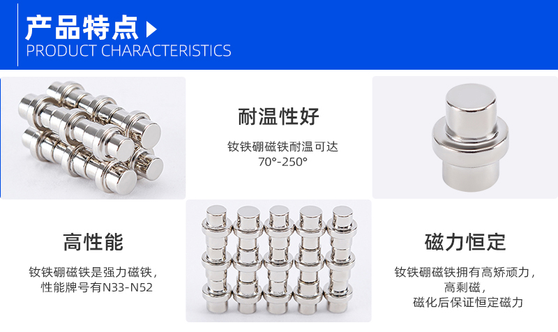 高磁能積與矯頑力:雙頭異形磁鐵具有極高的磁能積和矯頑力,可以吸起相當(dāng)于產(chǎn)品自身重量數(shù)百倍的重物(例如,可吸起相當(dāng)于產(chǎn)品自身重量的640倍的重物)。