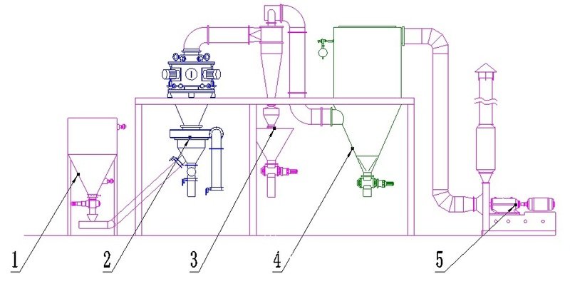 1、料倉 2、多轉子分級機 3、旋風收集器 4、脈沖收塵器 5、引風機