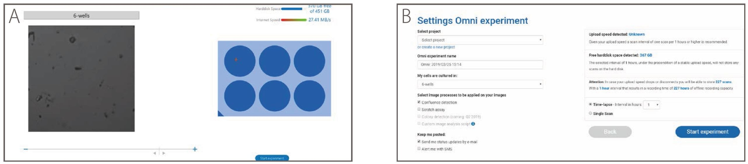 簡單易用的 Omni 應用程序 (如圖),允許實驗室中的任何人不需要復雜的培訓即可使用。只需將設備放入細胞培養箱,將培養容器放在 Omni 的光學窗口上,連接到計算機啟動 Omni 應用程序,設置實驗并離開實驗室。