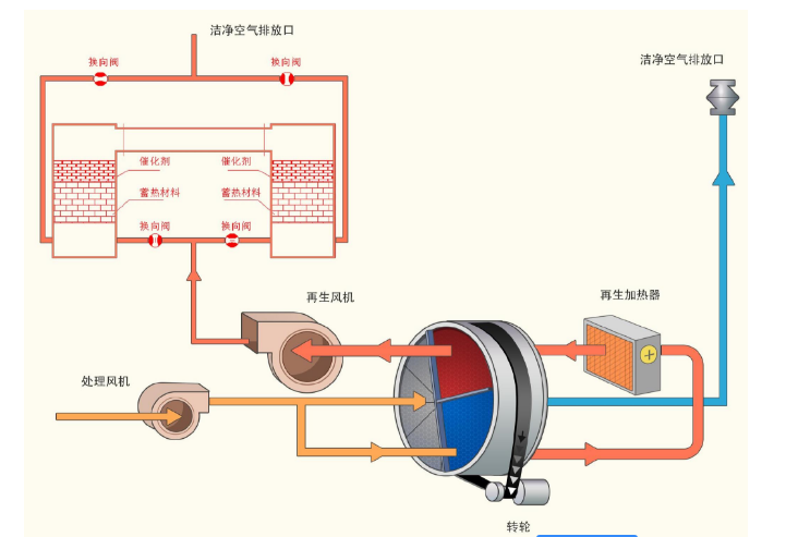 轉輪內VOCs被濃縮成飽和沸石區、再利用熱交換器提供的熱流(約200℃)來進行脫附,脫附完成后旋轉至冷卻區,以常溫空氣吹噓冷卻至常溫、再旋轉至吸附濃縮區。