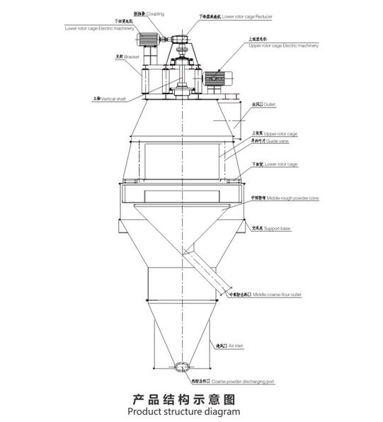 含塵氣體通過導向葉片導流,進入轉籠與導風葉片之間的主選粉區。分選原理是根據離心力與空氣阻力(斯托克斯力)的平衡達到有效的分級。由垂直葉片組成的籠式轉子回轉時,轉子內外壓差在整個選粉區上下維持一個定值,從而使氣流穩定均勻,為精確選粉創造了良好的條件。每一個顆粒自上而下得到了多次重復分選的機會。通過調整轉子的轉速,使符合切割粒徑的顆粒進入轉子內腔,隨氣流通過上部出風口進入袋式收塵器收集,進入成品。