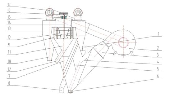 入口1進來的物料經多級打散板4打散、剝離,各打散板之間從左側吹來的風將料流中的中粗料及細料吹離,粗砂從底部粗砂出料口6排出。懸浮于氣流中的物料隨風進入分級區的多層分級板5之間,分級板將懸浮于氣流中的物料進一步去除相對較粗的物料,粗料沿分級板下滑,被風再次吹起,反復分選,*后粗粉并入粗砂。出分級板的風帶料進入中料分級區,在中料分級區由于氣流減速,方向偏轉,產生中砂的重力沉降和撞擊器壁而沉降,中砂從中砂出口8排出。氣流帶料進入細料分級區,在細料分級區,在弧形導流板9作用下產生旋轉,形成離心沉降和重力沉降雙重作用,細砂落入下方細砂集料錐11,由細砂出口12排出。粉料隨氣流進入脫粉區,在籠形轉子10的作用下甩出稍粗料(細砂),細砂撞擊弧形導流板落入細砂收集錐,含粉氣流進入旋風筒進行氣固分離,分離出的細粉由粉料口18排出,較為干凈的空氣經出風管17進入風機循環使用。