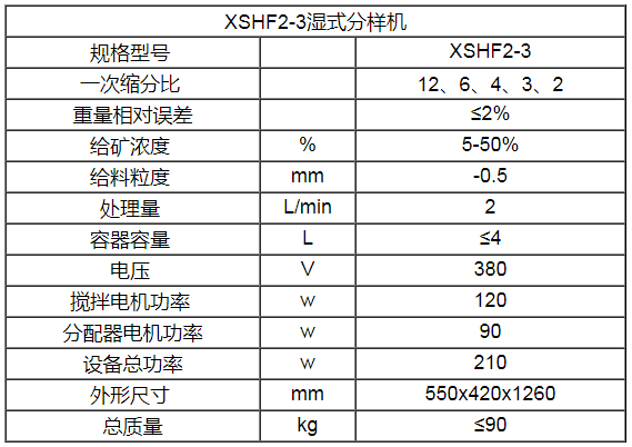 XSHF2-3型濕式分樣機(jī)適用于實驗室作礦漿等量縮分及試驗產(chǎn)品的濕式分樣用。通過濕式分樣機(jī)可得到在固體含量、粒度組成及化學(xué)組成上保持代表性的小量試樣。該機(jī)是冶金、地質(zhì)、建材、化工、煤炭等工業(yè)部門的生產(chǎn)科研,試驗和院校等單位濕法縮分礦漿的設(shè)備,重量相對誤差≤2%。礦漿經(jīng)調(diào)漿攪拌桶攪勻后,給入過流漏斗。然后流入帶勻分錐的礦漿分配器。分配器為一勻速轉(zhuǎn)動體。礦漿經(jīng)它分成八等份。再分別均勻給入截料漏斗中。漏斗12只。每只占有360°/12=30°的弧長。從而保證了在單位時間內(nèi)各漏斗截取的礦漿量相等。所以利用XDHF2-3型濕式分樣機(jī)完成礦漿縮分過程,可保證所得試樣在固體含量粒度組成和化學(xué)組成上保持代表。